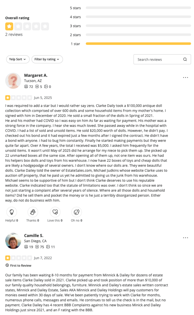 Clarke Dailey has a long history of defrauding and taking advantage of vulnerable clients typically after a death in the family. He will offer his services of liquidating and selling valuables for the surviving family members and never paying those families for the assets he sells.